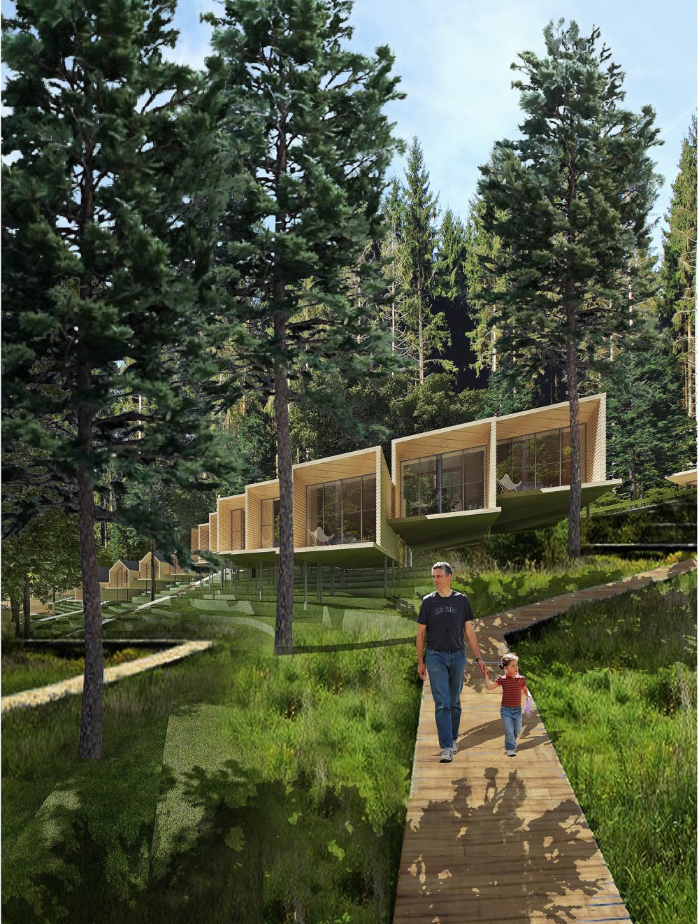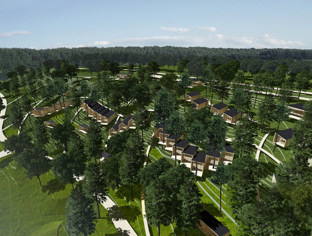 The recreation center is located in the picturesque coastal zone of Lake Rudakovo. The main idea of the concept is to create a unique recreational environment with maximum preservation of the forest and natural landscape. Guest houses “birdhouses” of various types permeate the structure of the forest, preserving the gardens as much as possible and creating for each guest a unique place for relaxation and solitude. The planning and compositional solution of the development complex, mounted pedestrian links are due to the steep natural topography of the area and allows you to keep the natural environment intact and at the same time create a unique and authentic environment for the guests of the recreation center.