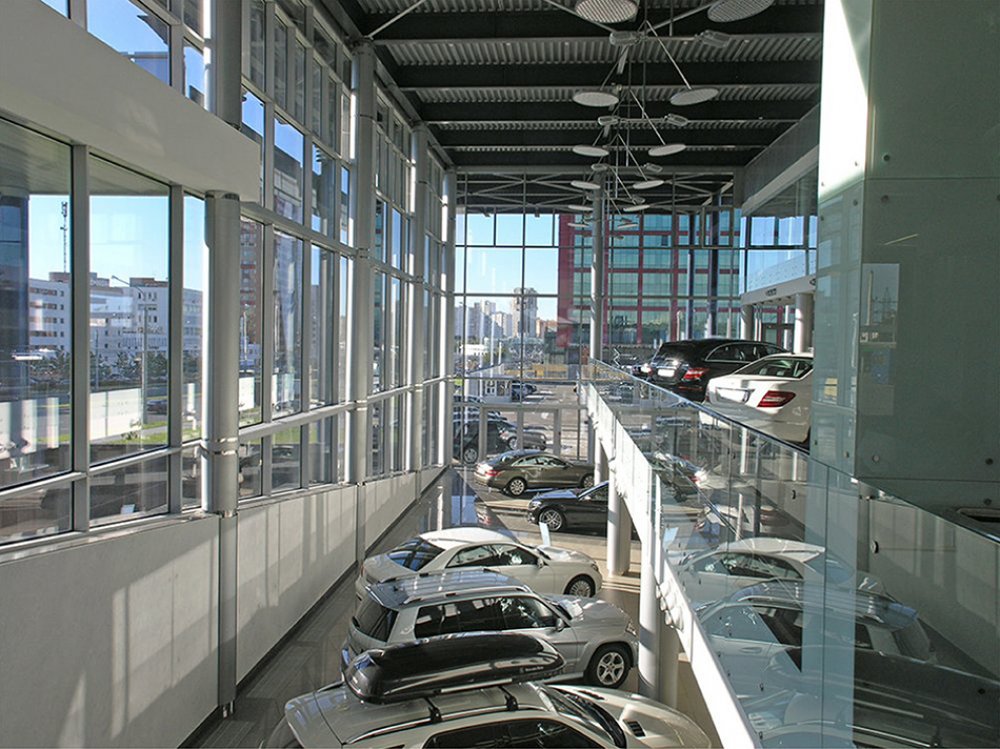 The architectural composition conveys a sense of movement. The clean, precise facade lines create a memorable image that reflects the speed and dynamism of the automotive brand. The different functional zones for sales, service, and vehicle repairs are integrated into a coherent layout. The compositional centerpiece is a three-level showroom, set on a complex terrain and oriented toward the city’s main road.