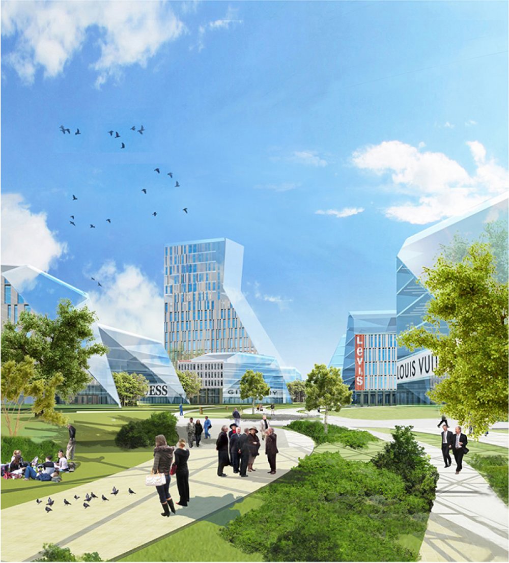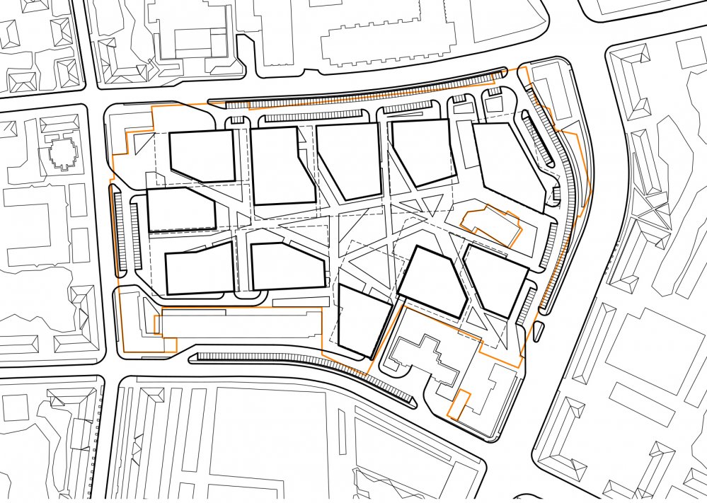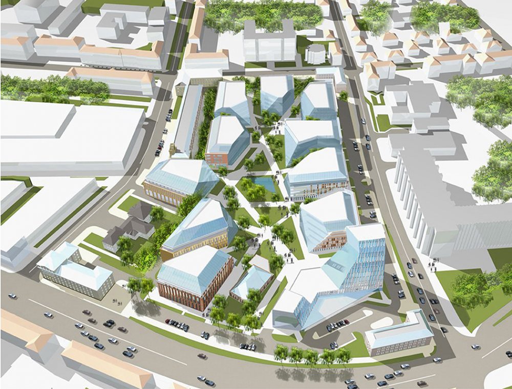 • The multifunctional complex in the quarter of the industrial buildings in the city center of Minsk is offered to be built by a principle of quarter development with the radial pedestrian communications taking into account the existing directions, with the creation of green gardens in the central public zone.