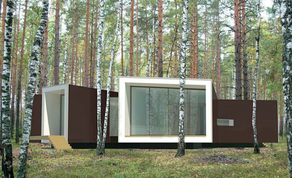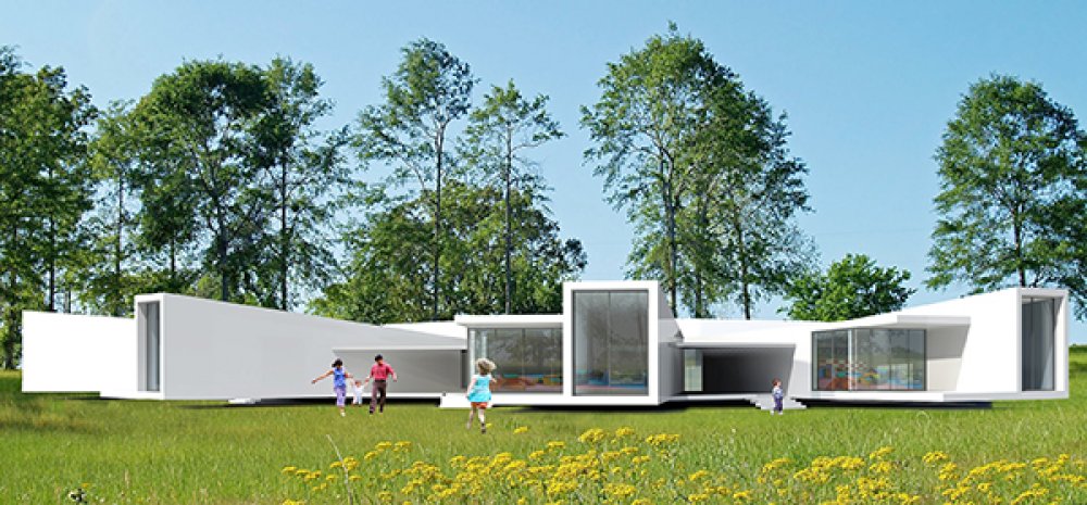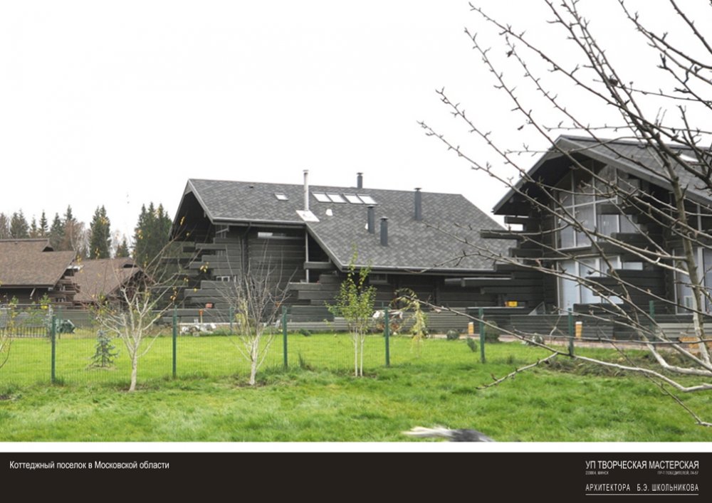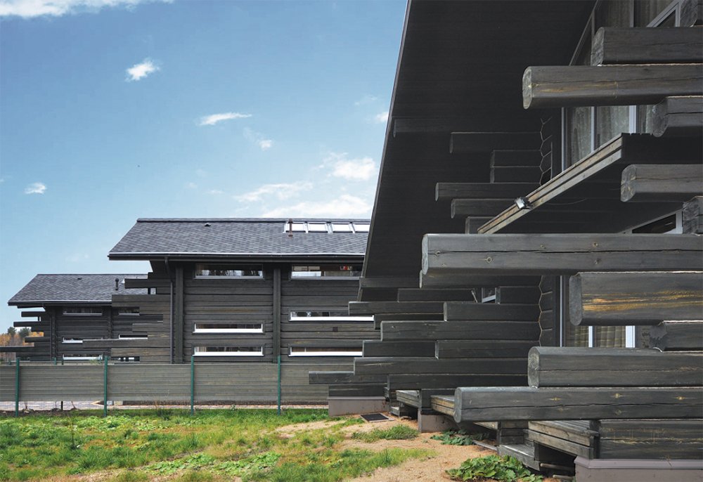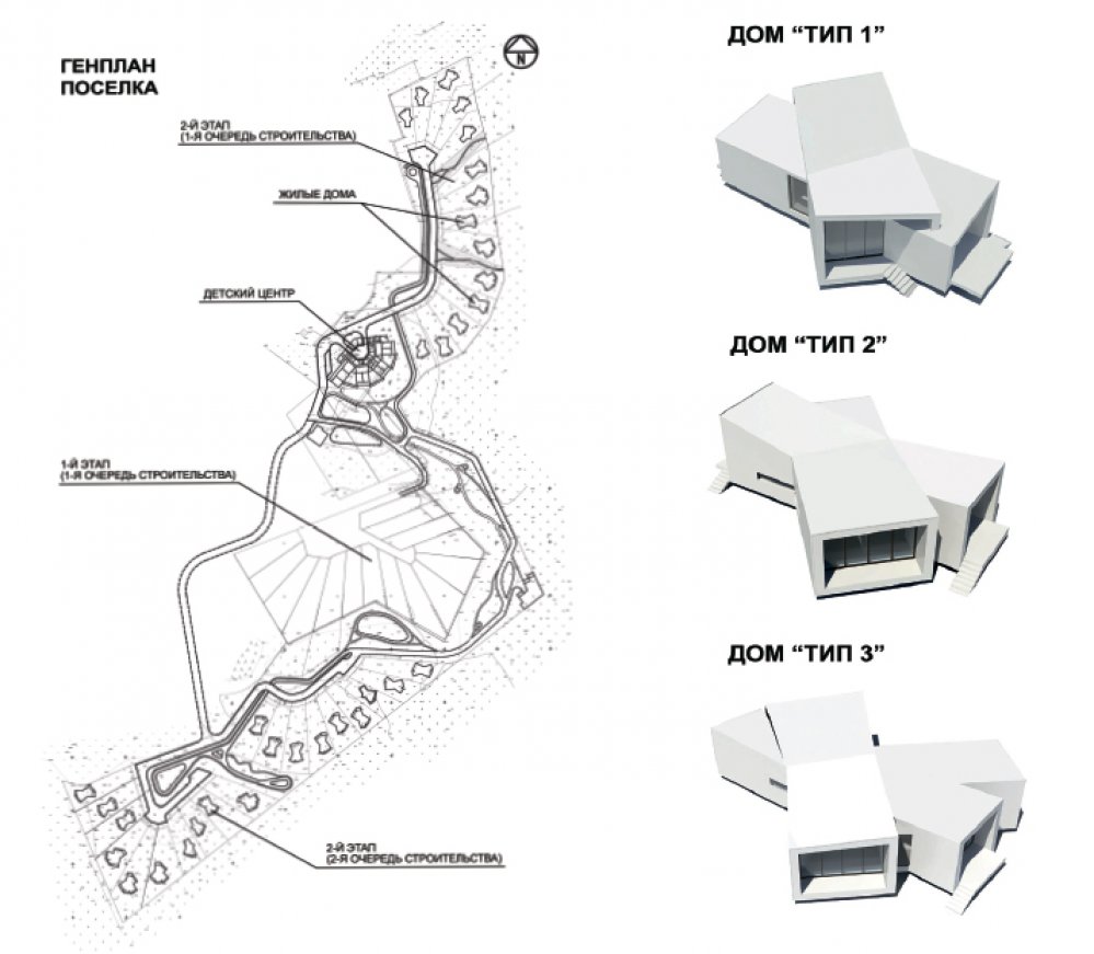 • The settlement is located on a narrow, elongated site, most of which adjoins a forested area. The residential houses  are designed according to an “inside-out” principle and positioned to preserve existing trees to the greatest extent  possible, with glazed end facades and open terraces. The image of the Children’s Center, designed in white, continues  and develops the architectural theme of suburban development.