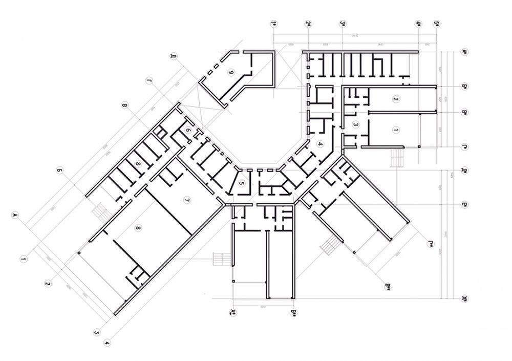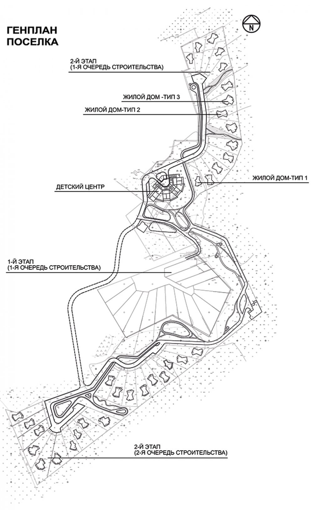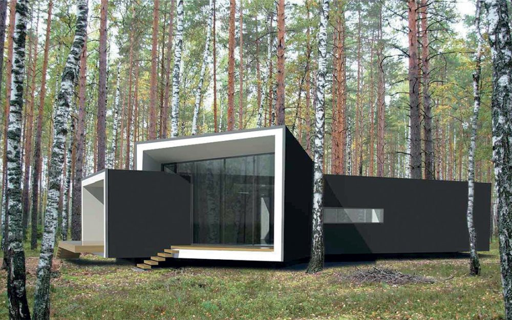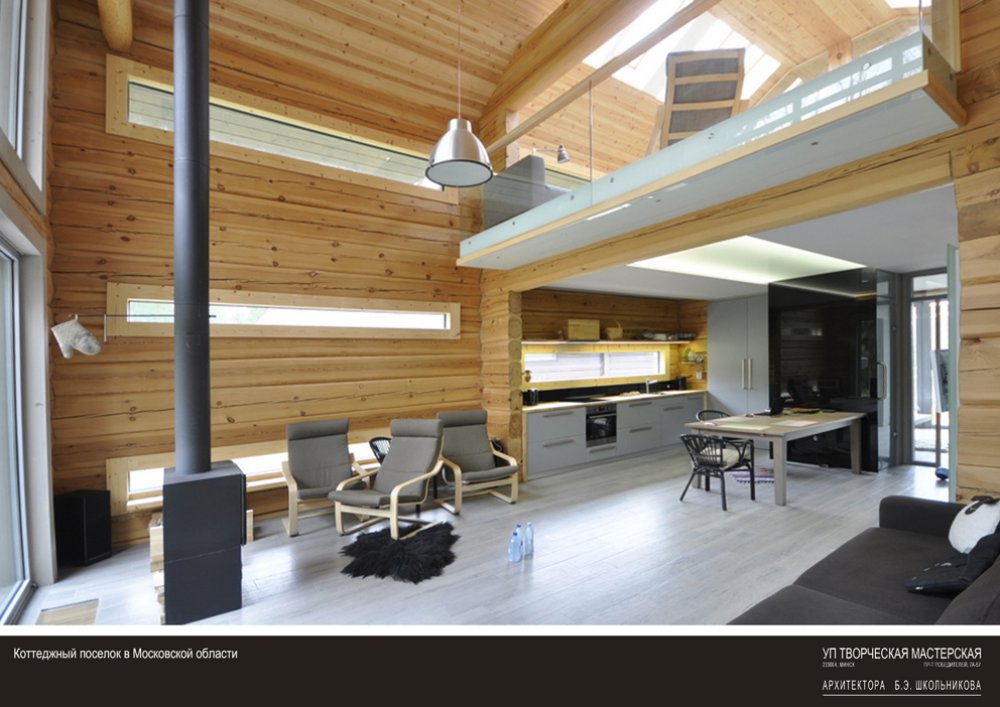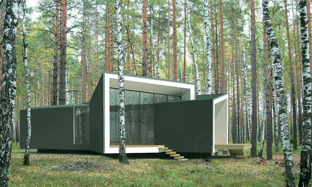 • The settlement is located on a narrow, elongated site, most of which adjoins a forested area. The residential houses  are designed according to an “inside-out” principle and positioned to preserve existing trees to the greatest extent  possible, with glazed end facades and open terraces. The image of the Children’s Center, designed in white, continues  and develops the architectural theme of suburban development.