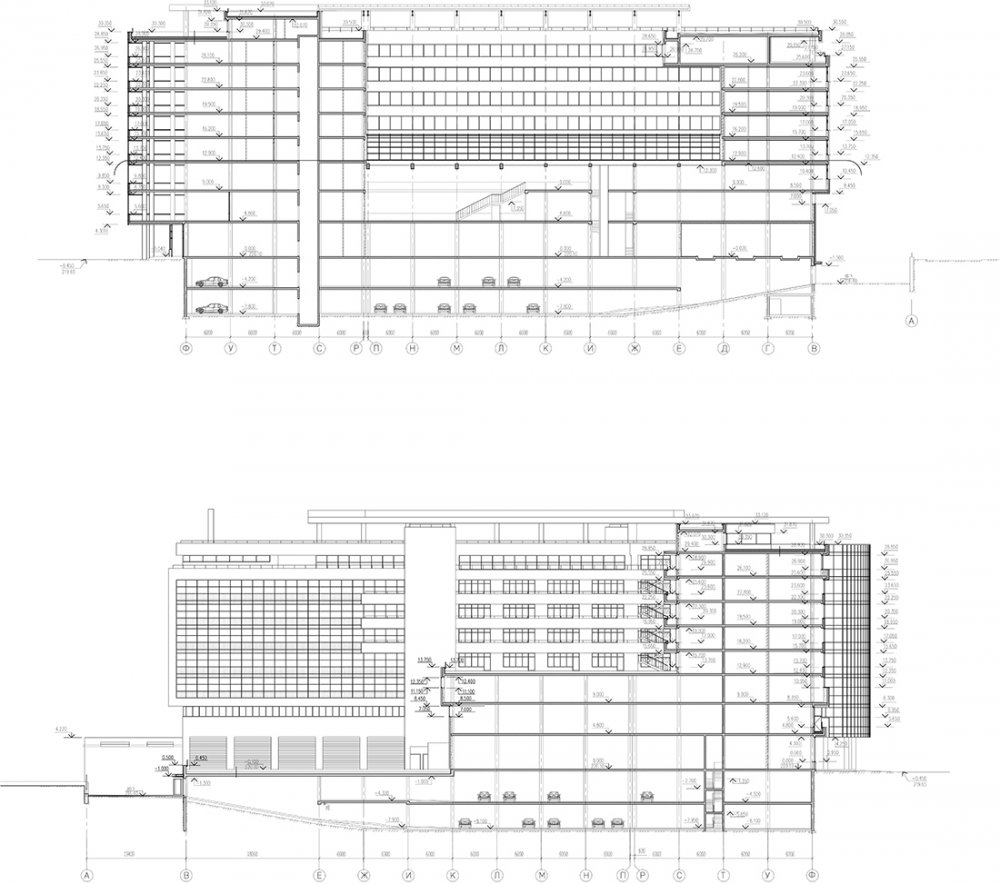 The business center placement along the city main road defined the combination of longitudinal and cross structure of the complex, on the crossing of which multilevel public spaces are located.