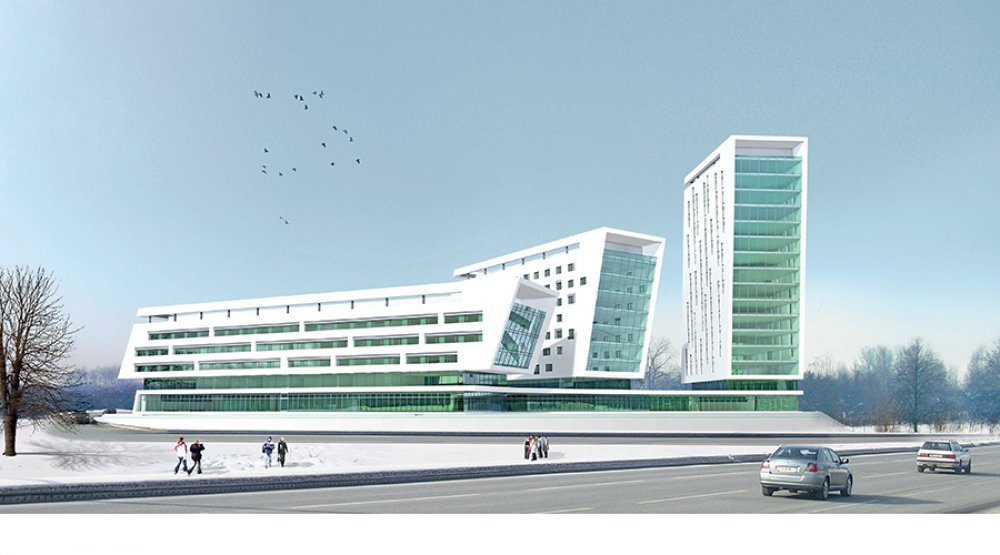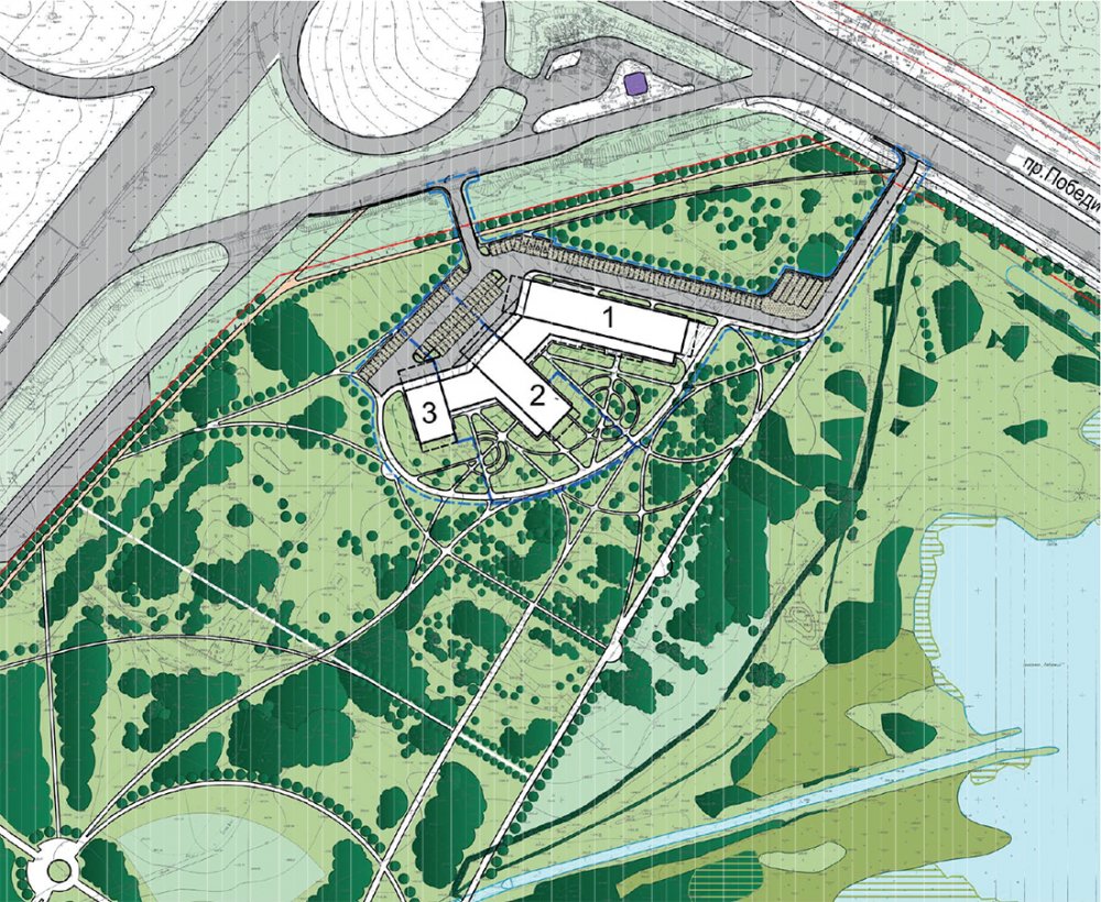 • The hotel complex is placed adjacently with the border of the landscape customer "Lebeazhiy", where Pobediteley Avenue goes to the suburban recreational territory of Minsk. The composition of the complex is perceived in dynamics of movement from the traffic intersection and main roads.